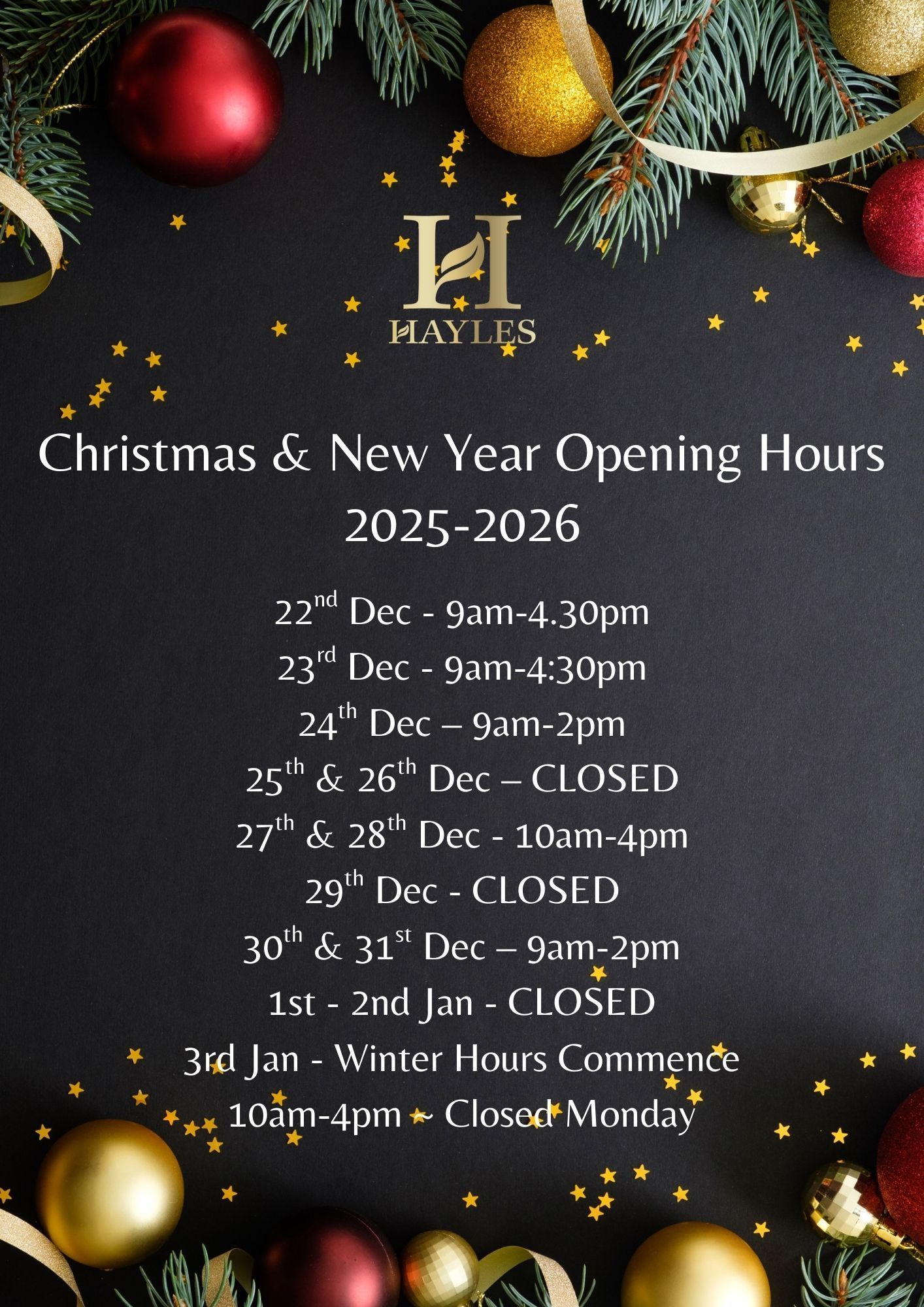 CHRISTMAS & NEW YEAR 25/26 OPENING TIMES